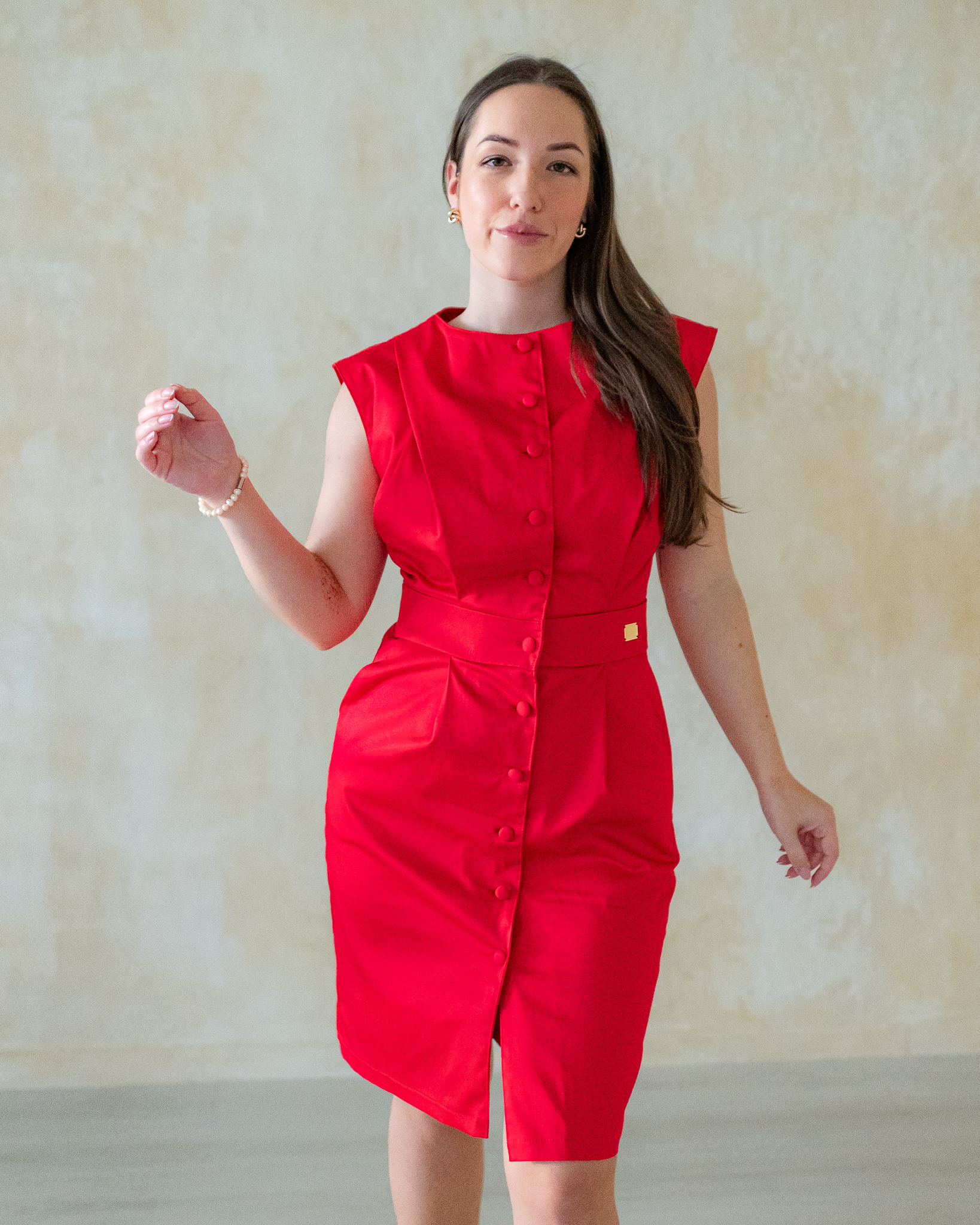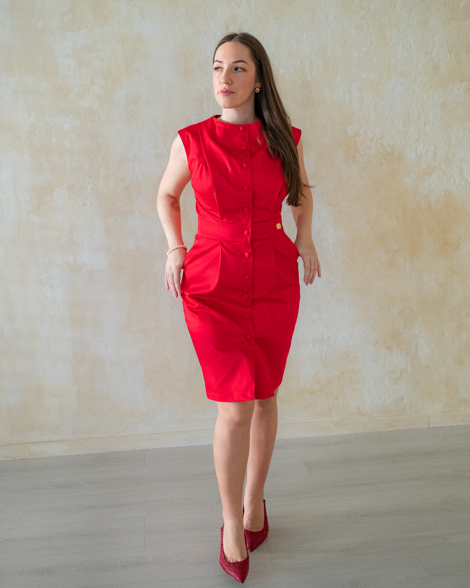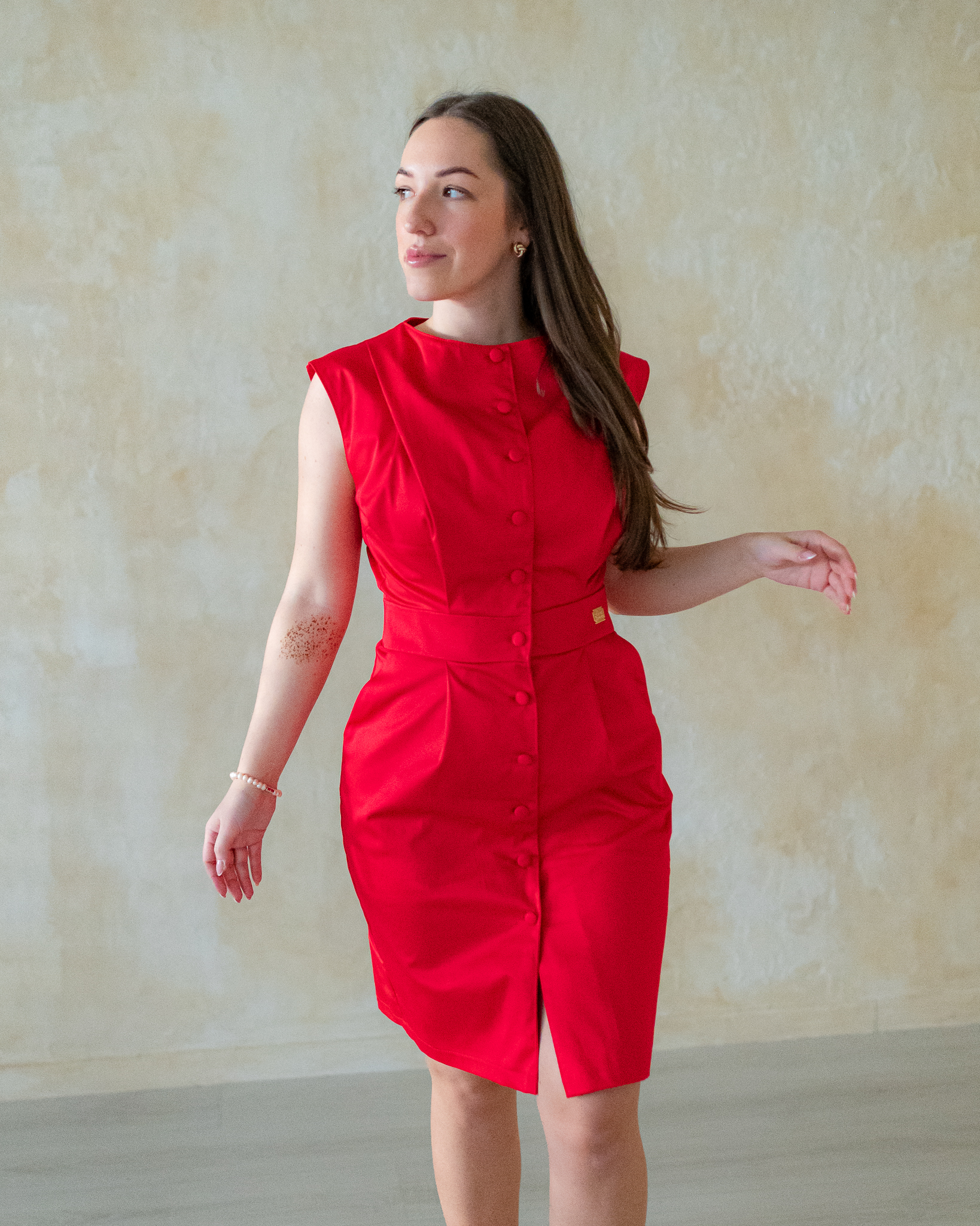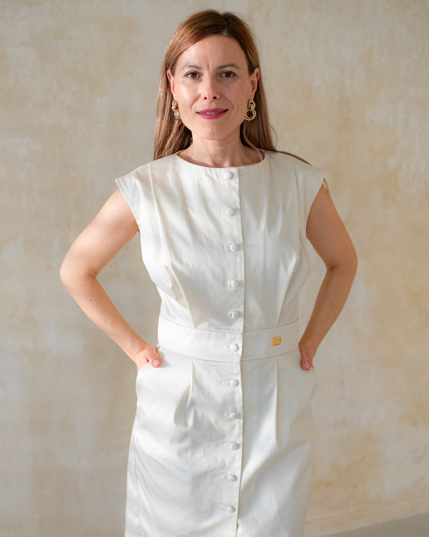 Po celej dĺžke šiat sú všité nenápadné látkou poťahované gombíky, vďaka ktorým pôsobia hladko, čisto a veľmi decentne. Dĺžka po kolená robí zo šiat Pippa univerzálny model vhodný na pracovné stretnutia aj súkromné udalosti, kde chcete pôsobiť reprezentatívne a sebaisto.