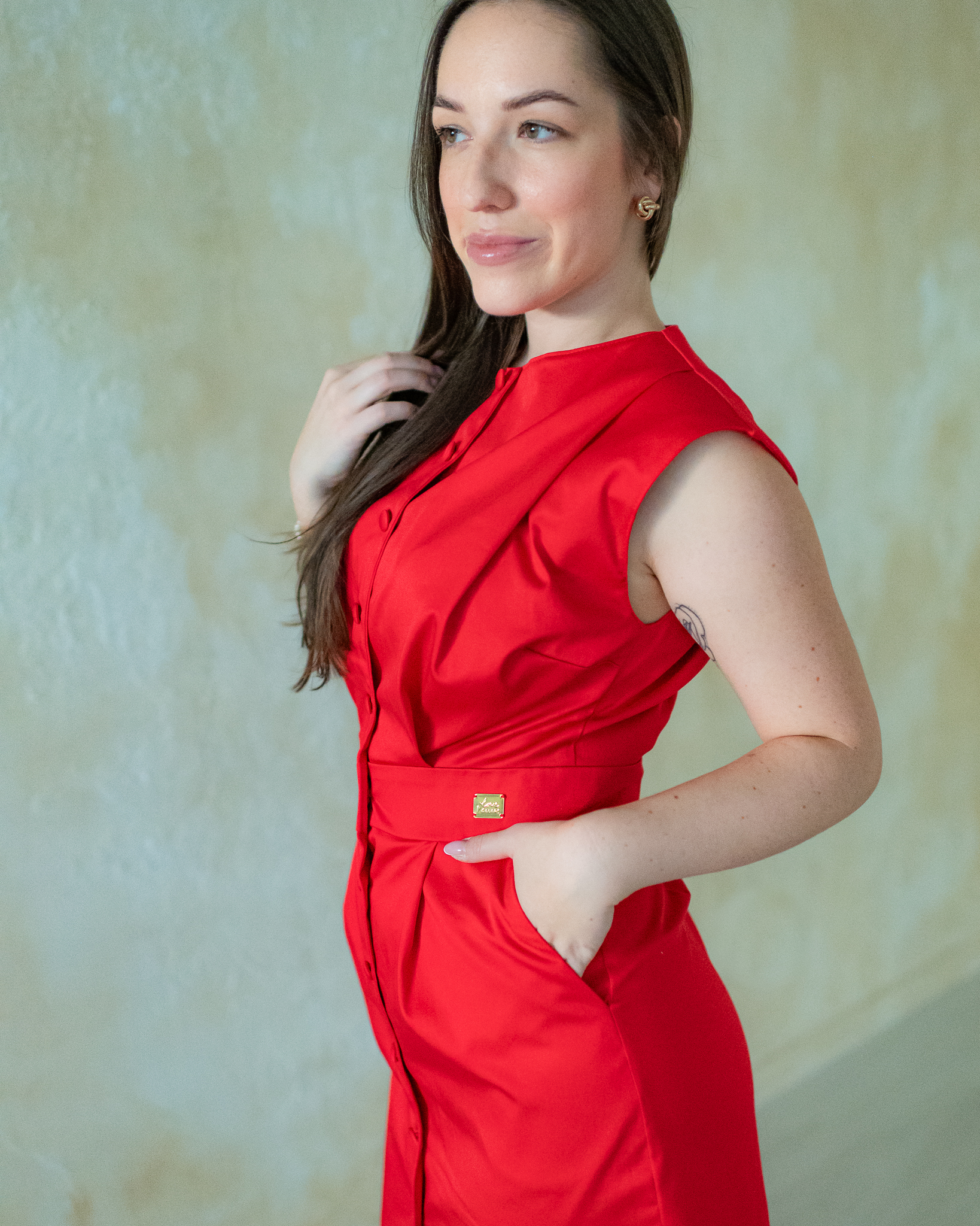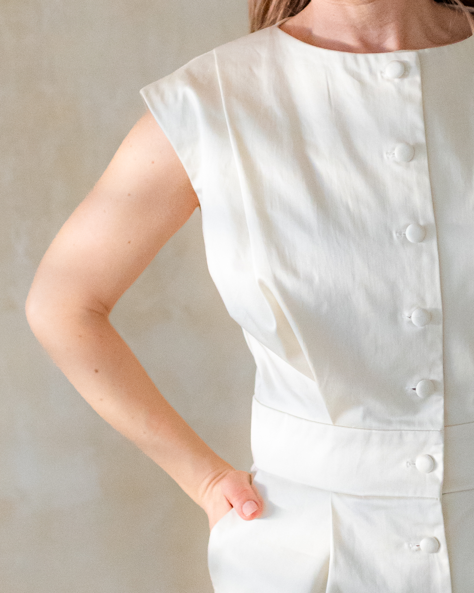 Vrchná časť šiat je prepracovaná elegantnými záhybmi a jemným zapínaním na ručne poťahované gombíky až po krk. Oblúčikový dekolt pôsobí rafinovane a dodáva modelu jedinečný charakter. Šaty sú bez rukávov, s jemne odhalenými ramenami vnášajú do formálneho strihu ženskosť a ľahkosť.