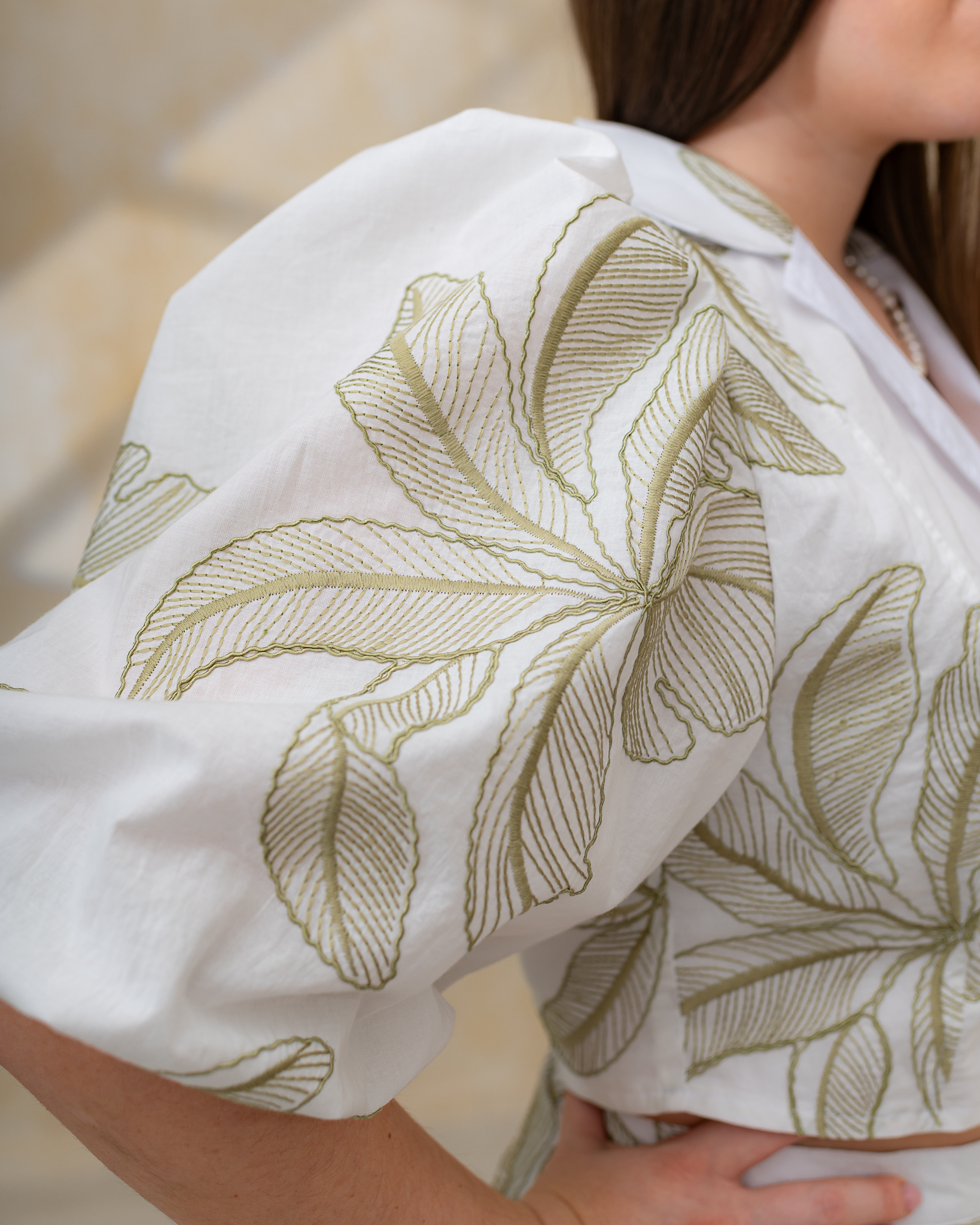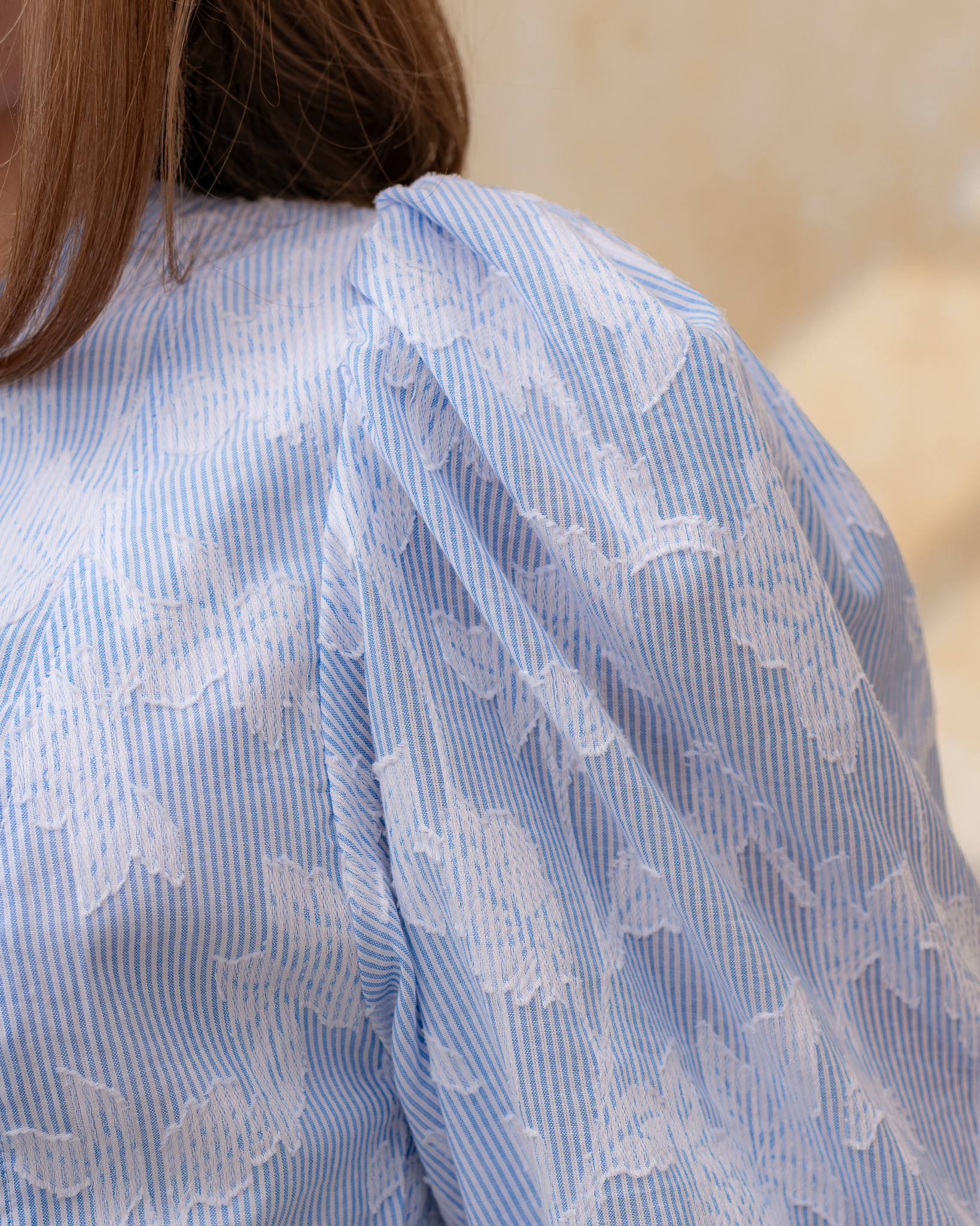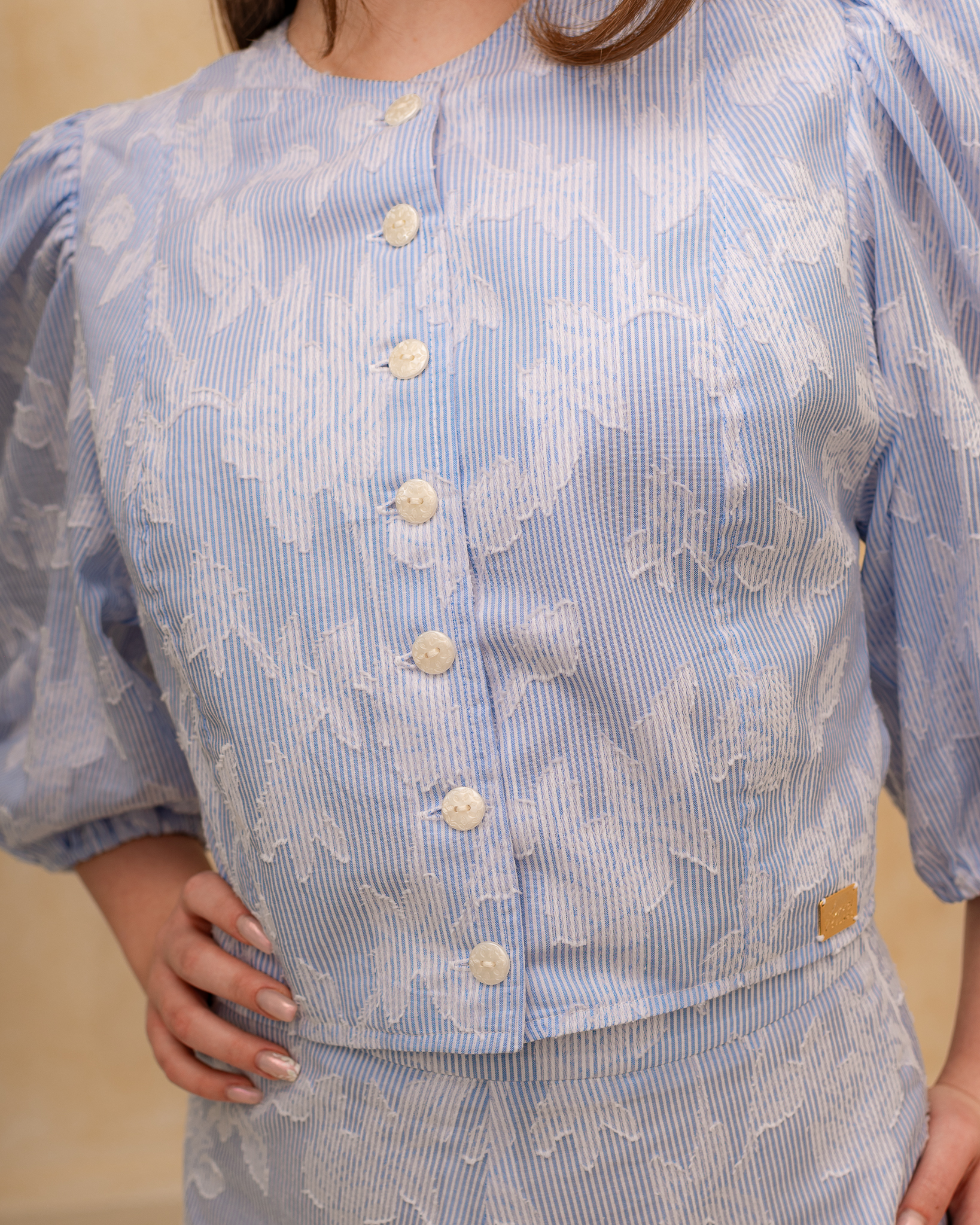 Dominantným detailom sú dlhé rukávy jemne nariasené na ramenách, ktoré vytvárajú nadýchaný a ženský efekt. V prednej časti sa blúzka zapína na malé ozdobné perleťové gombíky, ktoré jej dodávajú jemný a sofistikovaný vzhľad.