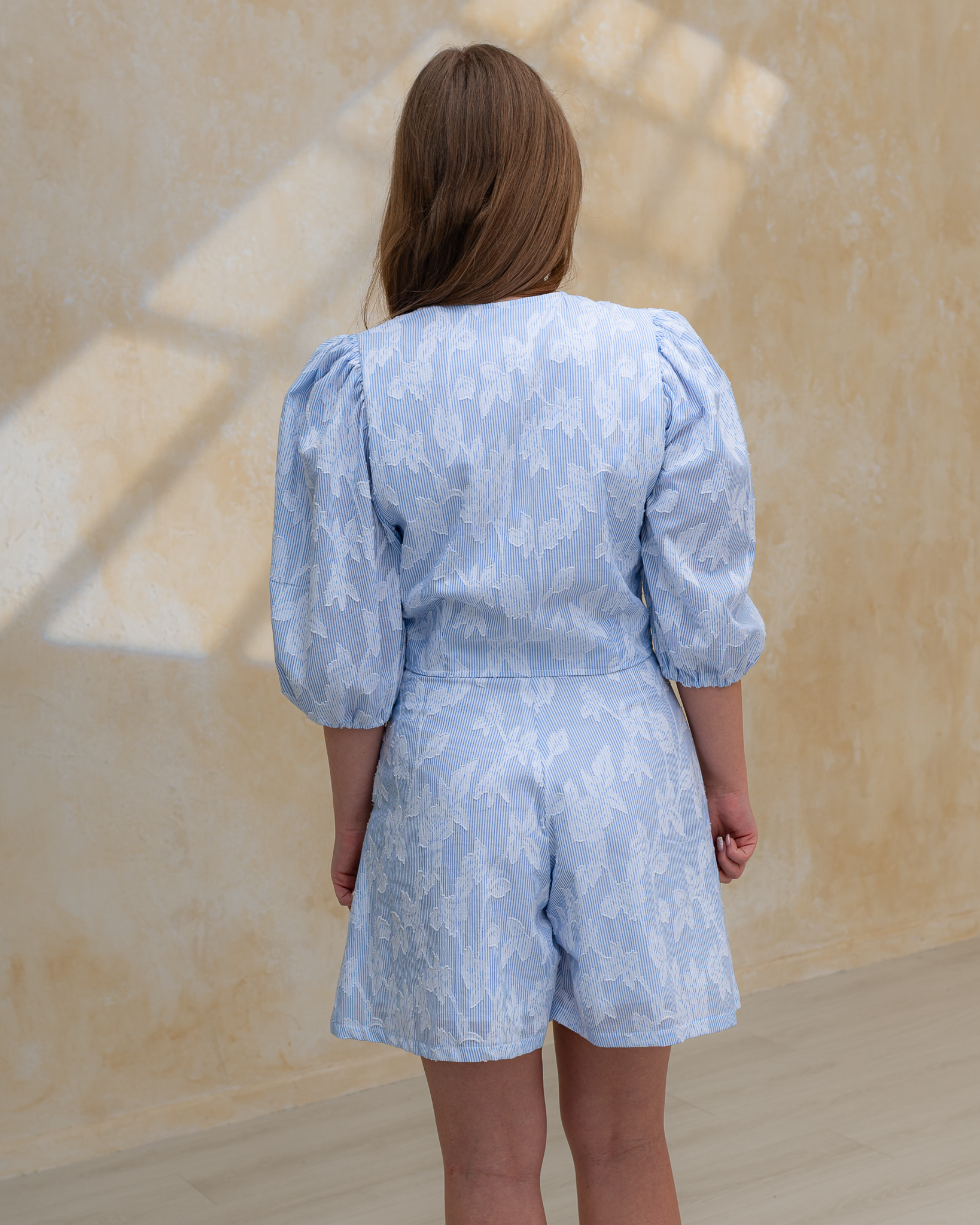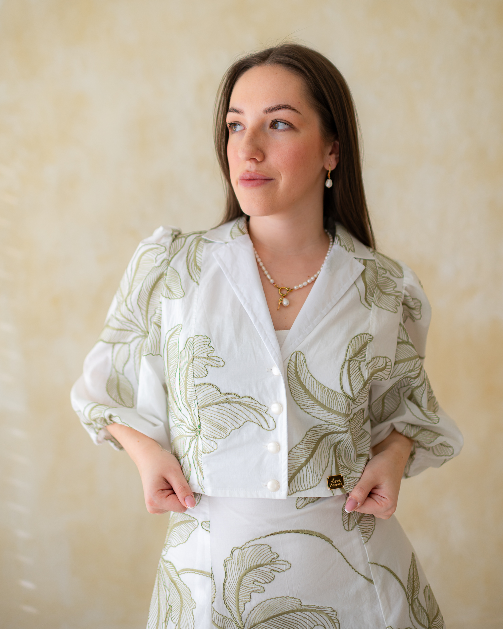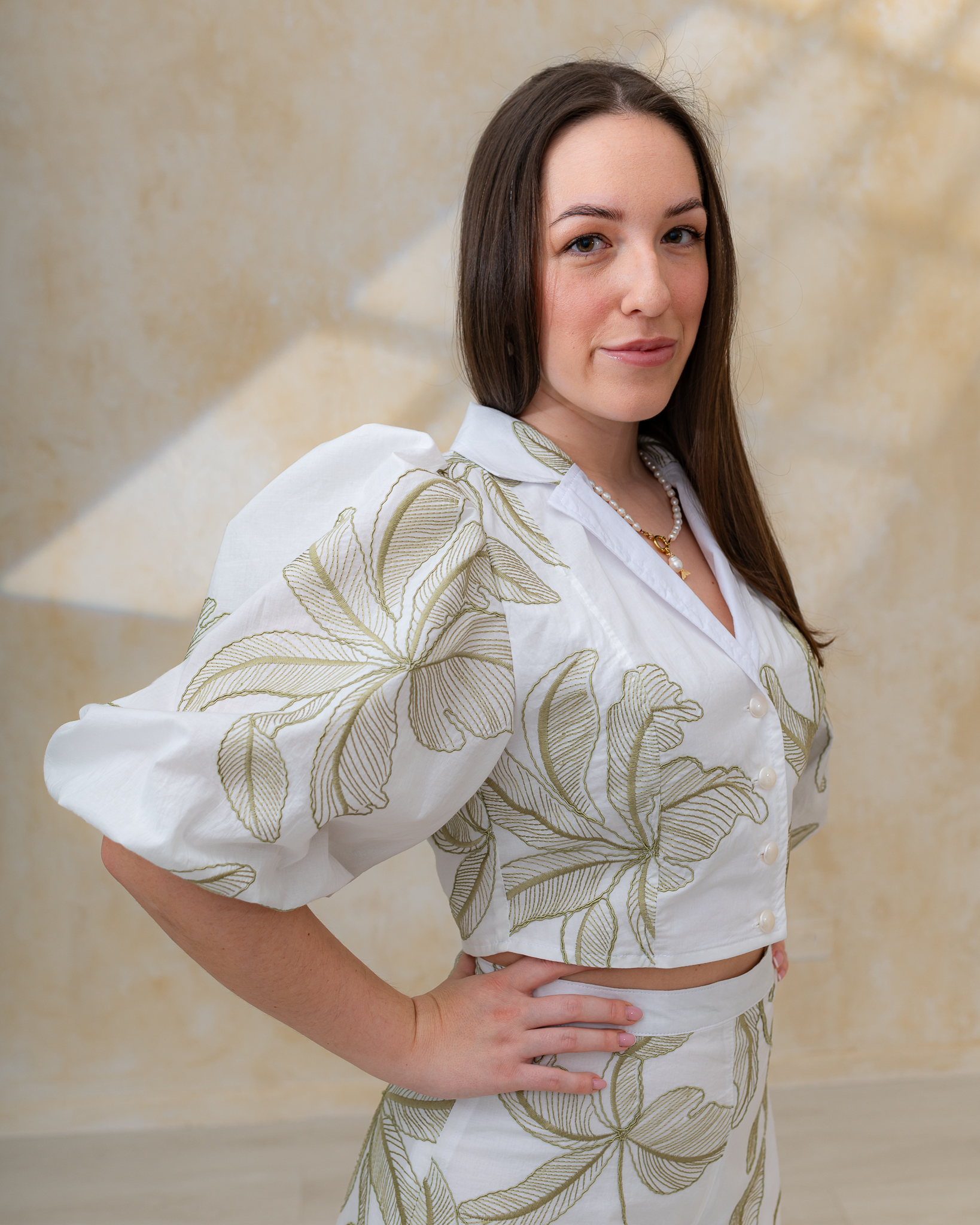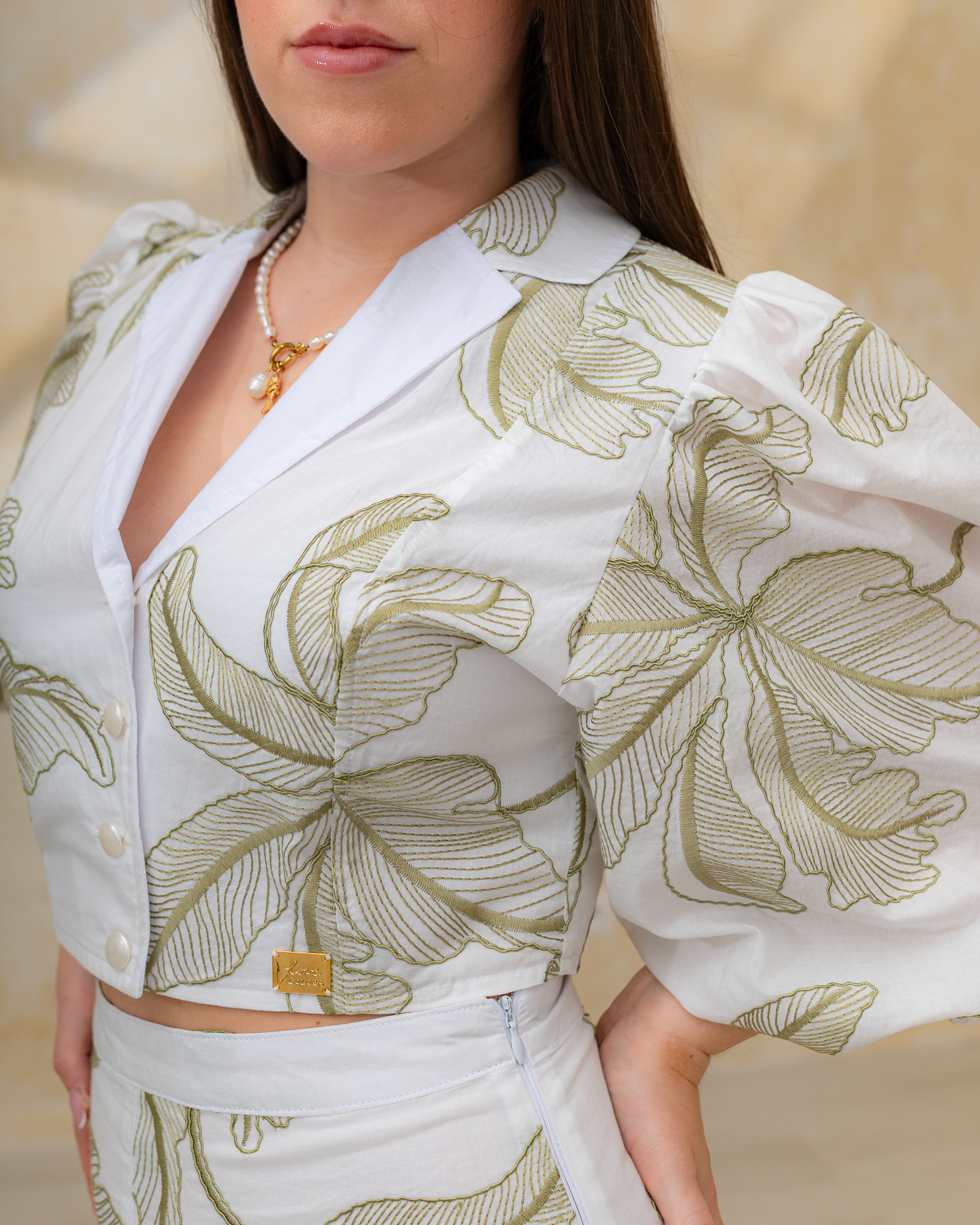 Dominantným detailom sú dlhé rukávy jemne nariasené na ramenách, ktoré vytvárajú nadýchaný a ženský efekt. V prednej časti sa blúzka zapína na malé ozdobné perleťové gombíky, ktoré jej dodávajú jemný a sofistikovaný vzhľad.