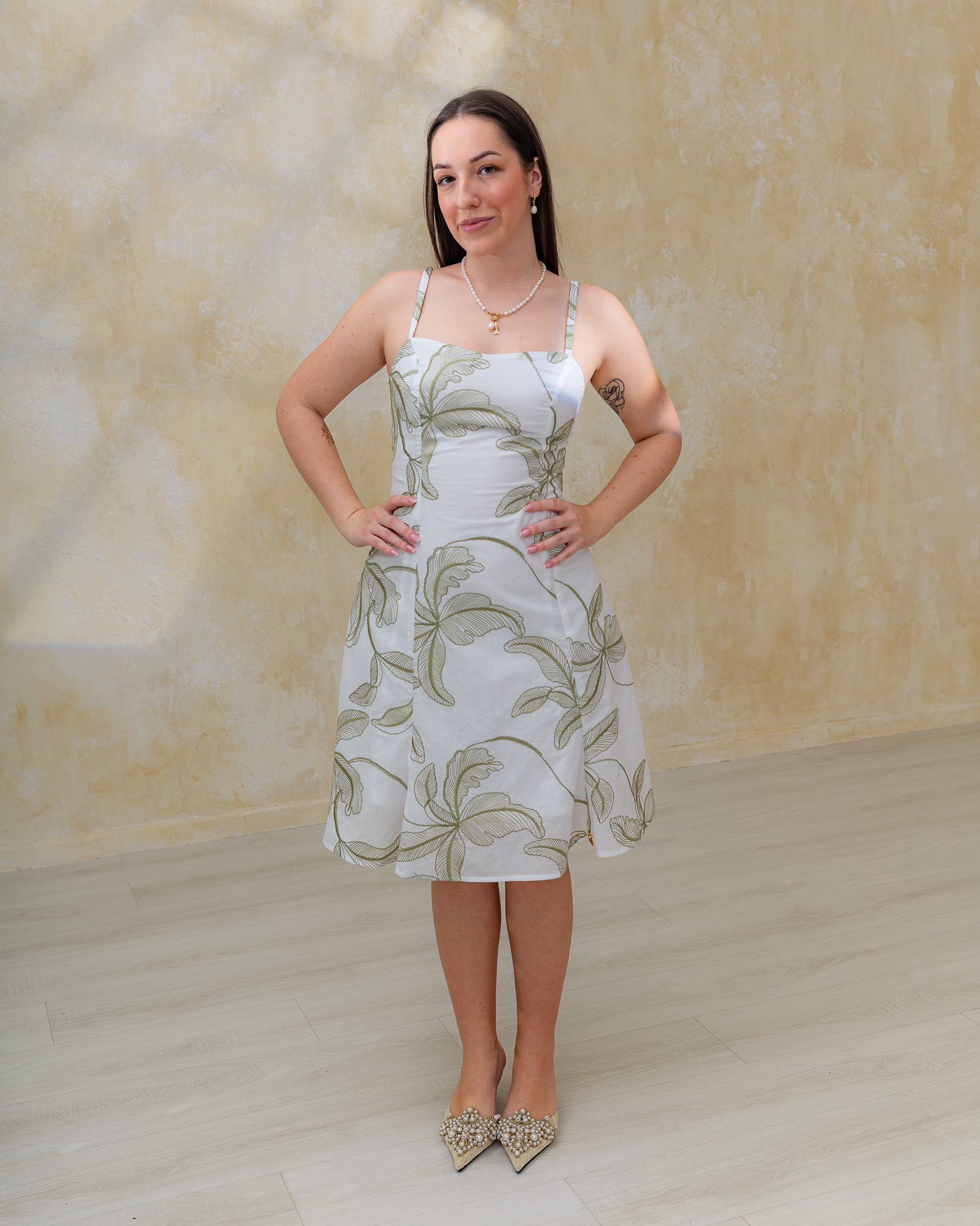 Predná časť šiat je jednoduchá a čistá, aby mohol vyniknúť samotný materiál, jeho štruktúra a vzor. Dĺžka siaha približne po kolená, čo robí šaty Priscilla ideálnymi na leto, dovolenku, prechádzky mestom, ale aj na spoločenské udalosti.